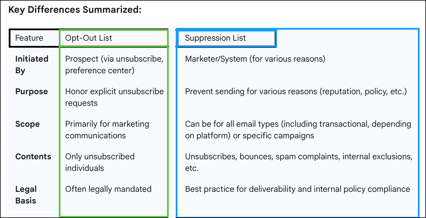 While an opt-out list is indeed a type of suppression, they're not interchangeable. Let's demystify these two crucial components of healthy email communication: